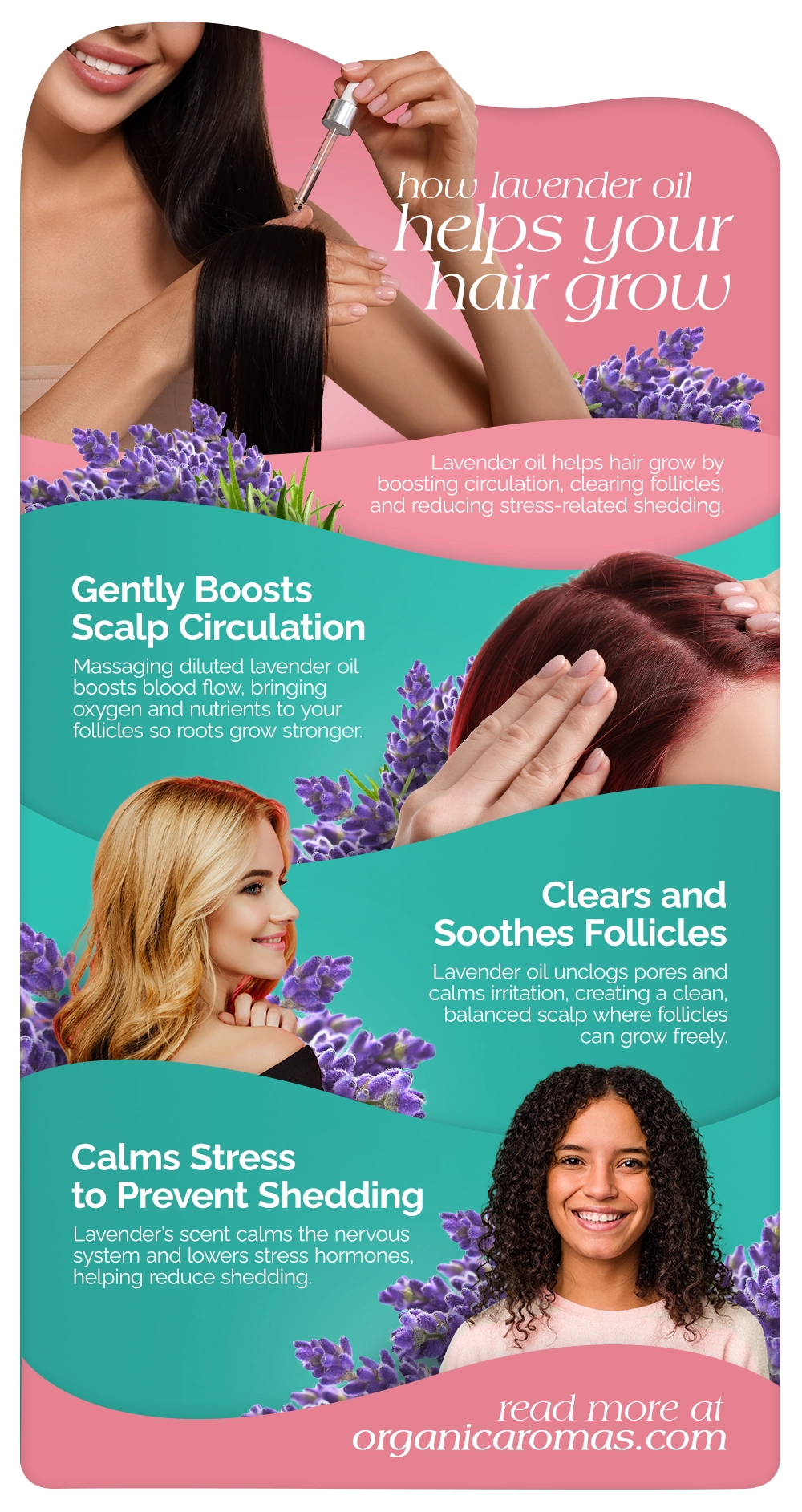 Have you ever wondered how lavender essential oil can help your hair grow? It works in three simple, natural ways. It wakes up circulation, keeps follicles clean and calm, and eases stress-related shedding. Each path- physical, microbial, and emotional- gives your roots real care.
