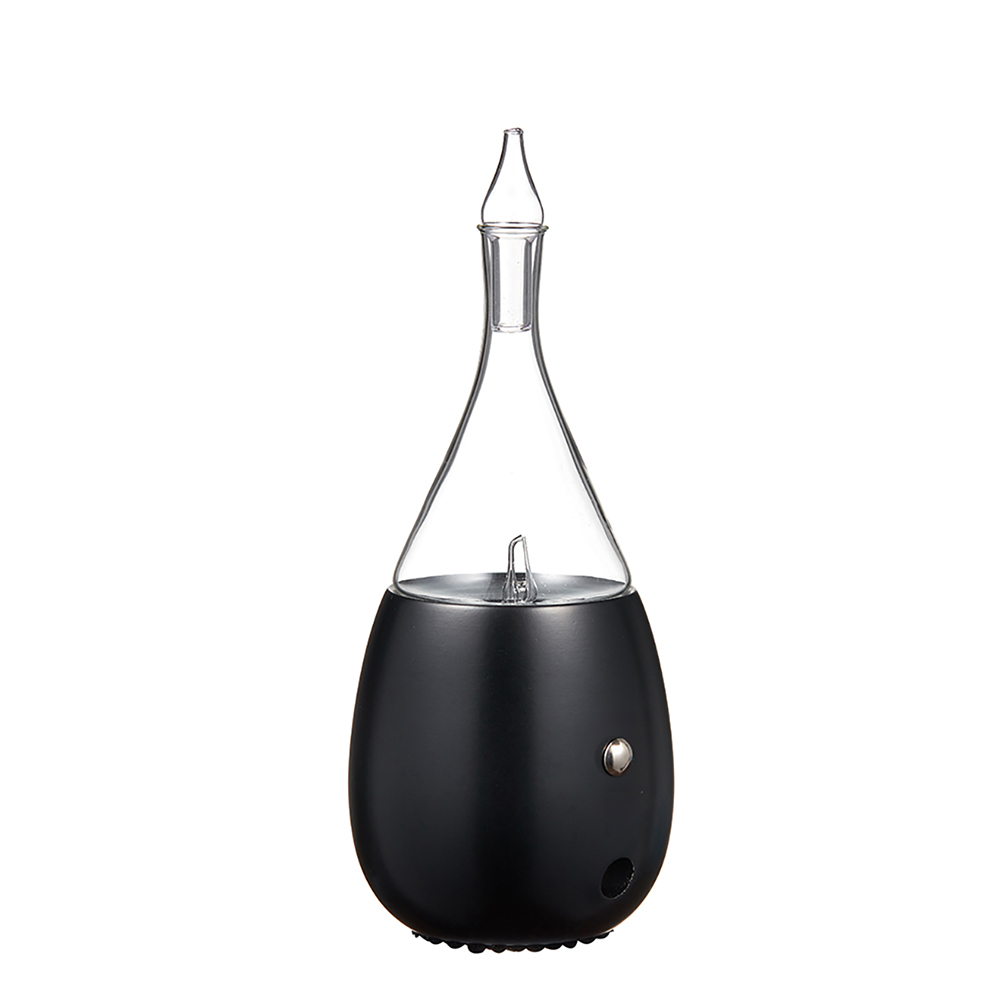 The Raindrop features a substantial, rounded plantation hardwood base and a striking conical glass reservoir with a distinctive candle-wick top. Its iconic teardrop silhouette has made it one of our most beloved designs.